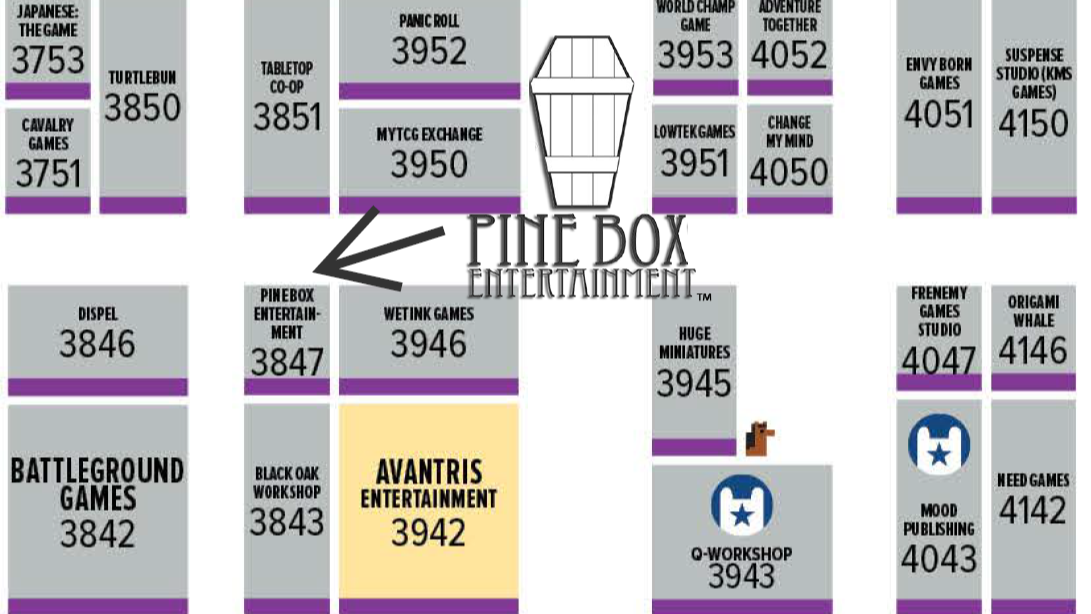Pine Box Booth is at 3847 where you can purchase items and sign up for events. The events will be downstairs, on the other side of the hall, where we were last year with Netrunner. Staff will be on hand to help escort folks. For those interested we will be looking to head to Monk’s Cafe Saturday night for a community dinner.